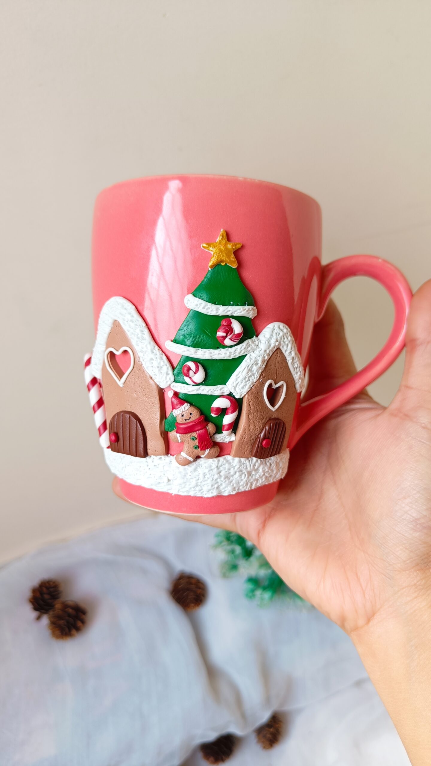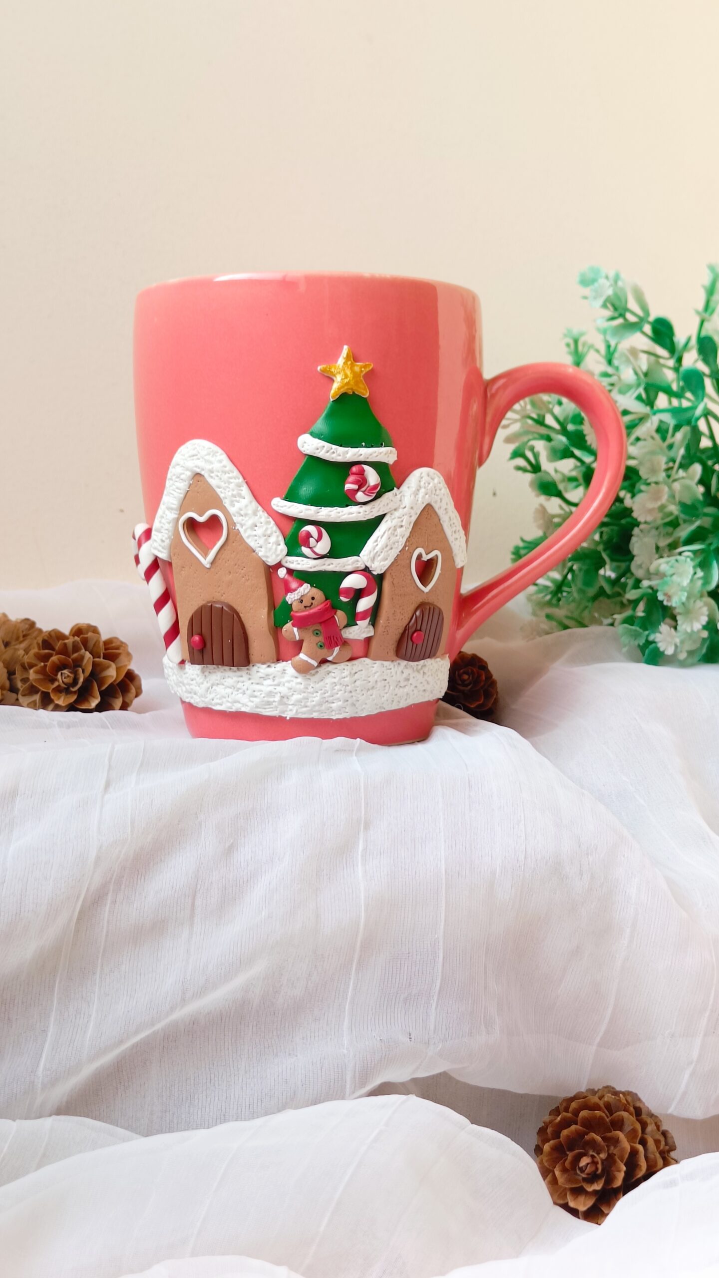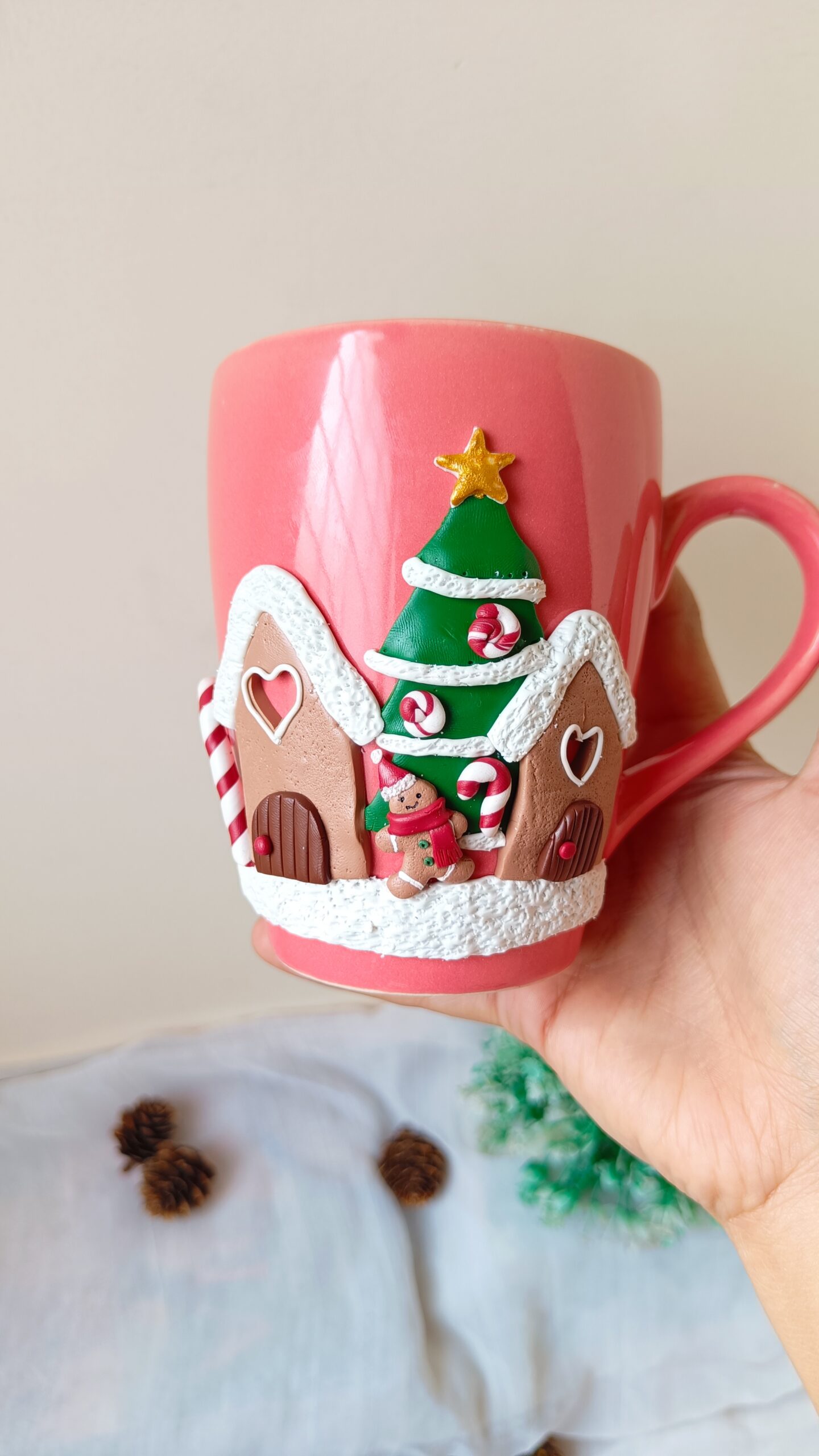 Celebrate the magic of the holidays with this Gingerbread Village Christmas Handmade Clay Mug, beautifully crafted with an intricate 3D polymer-clay design. The mug features a charming gingerbread house setup, a decorated Christmas tree, candy canes, and a festive gingerbread man—creating a mini winter wonderland right on your cup.