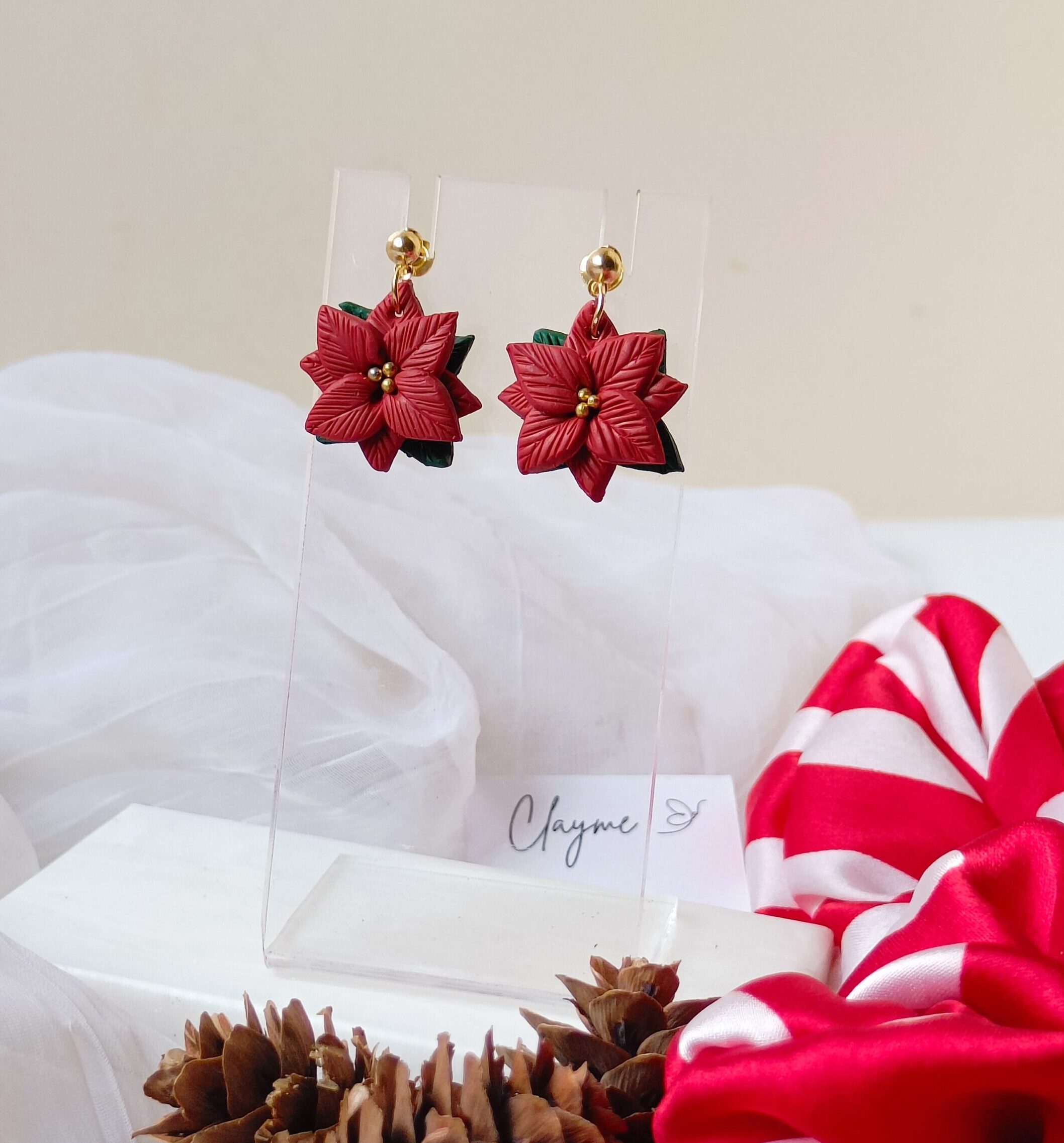 Celebrate the season in style with our Handcrafted Poinsettia Flower Statement Earrings. Each pair is meticulously made from high-quality polymer clay, featuring rich red petals, delicate texture detailing, and gold accents for a luxurious touch.