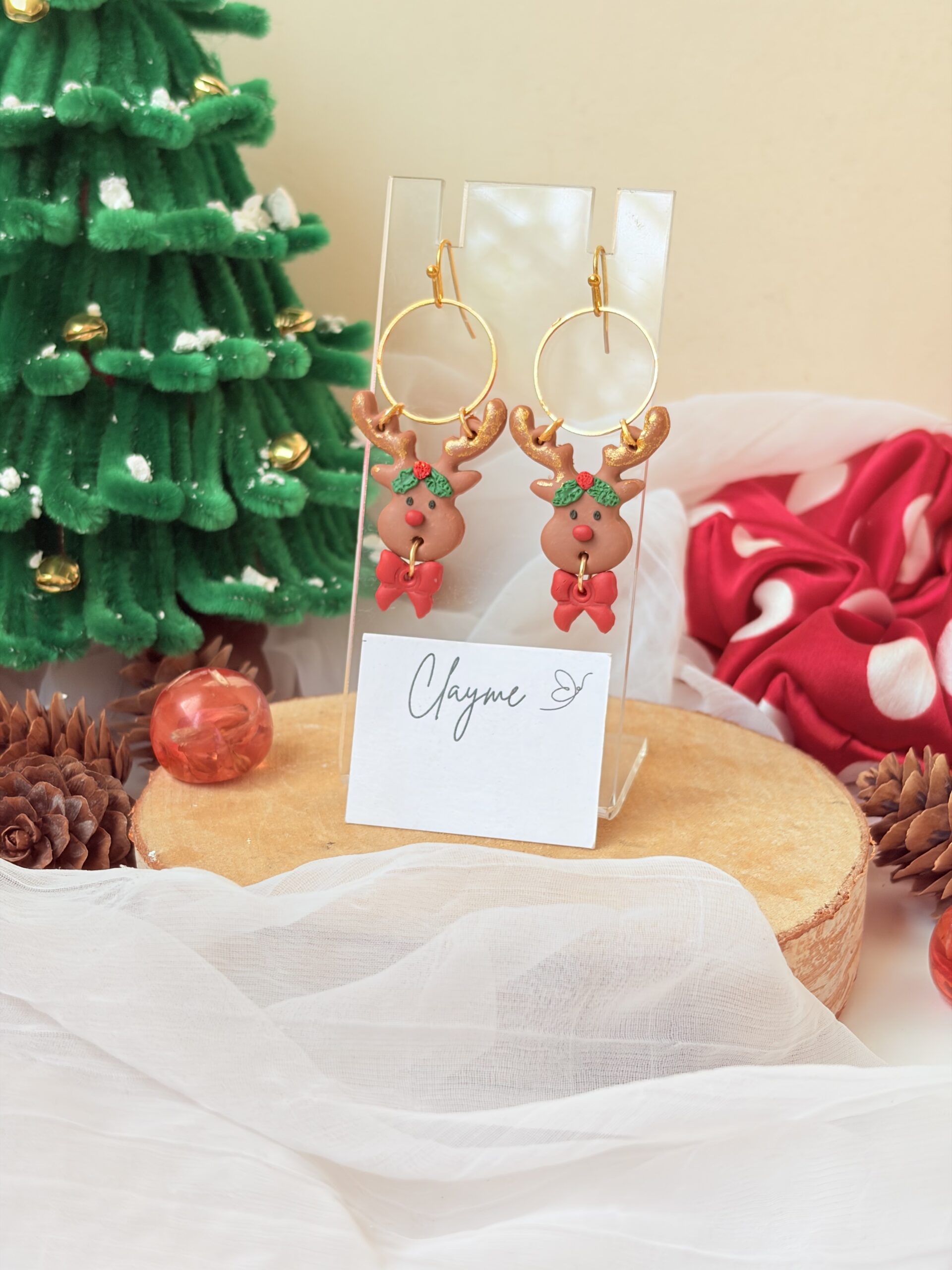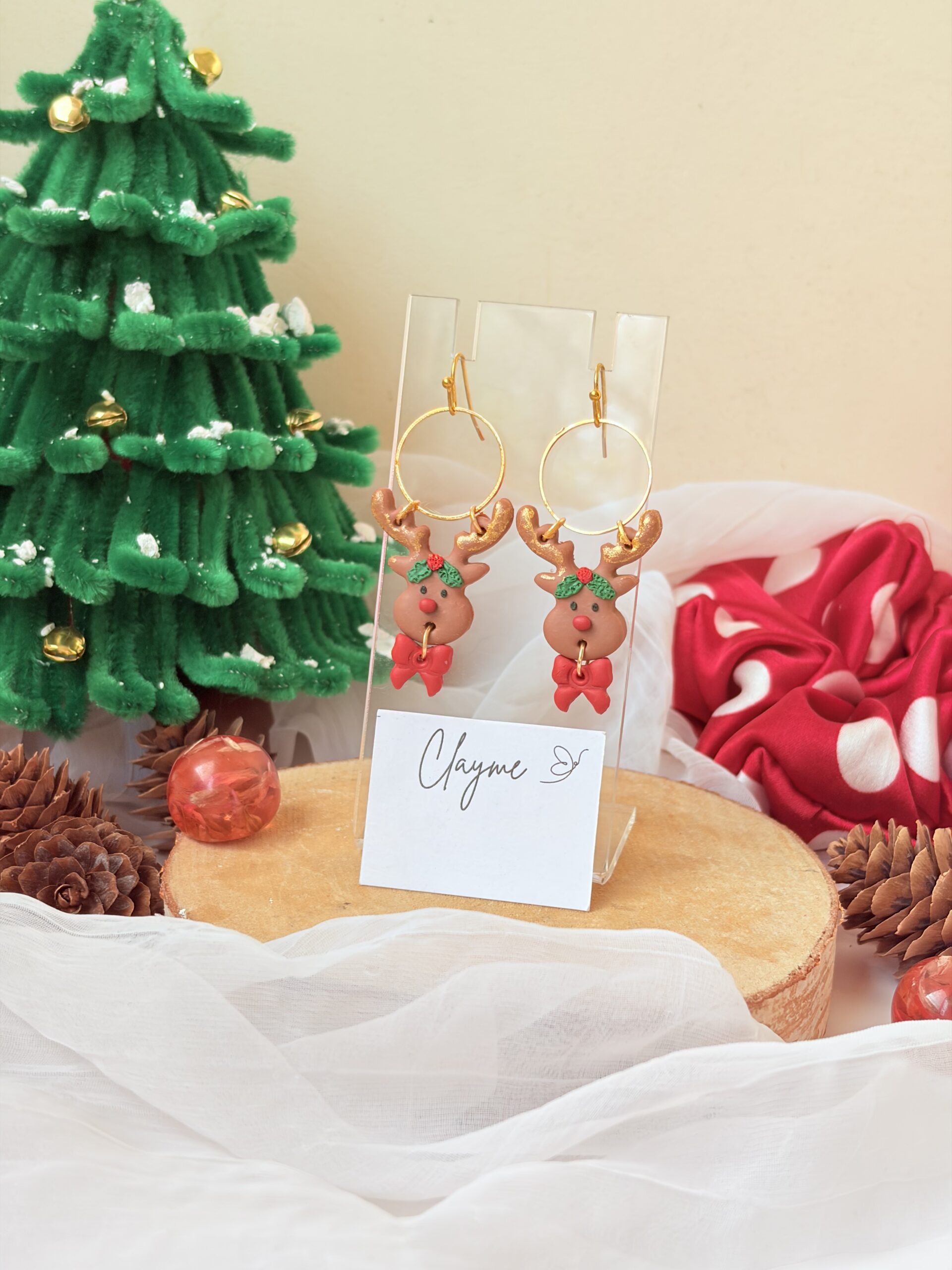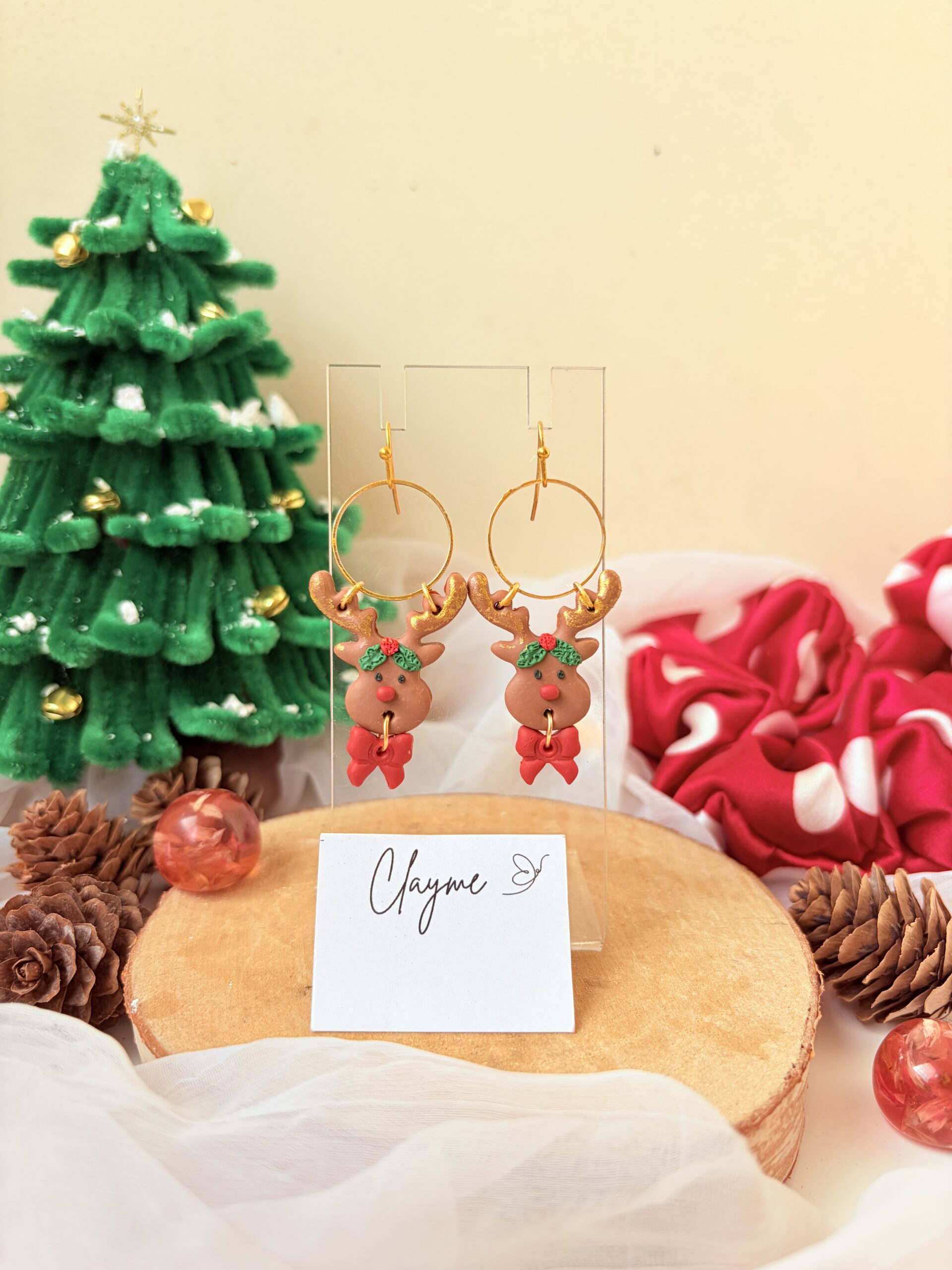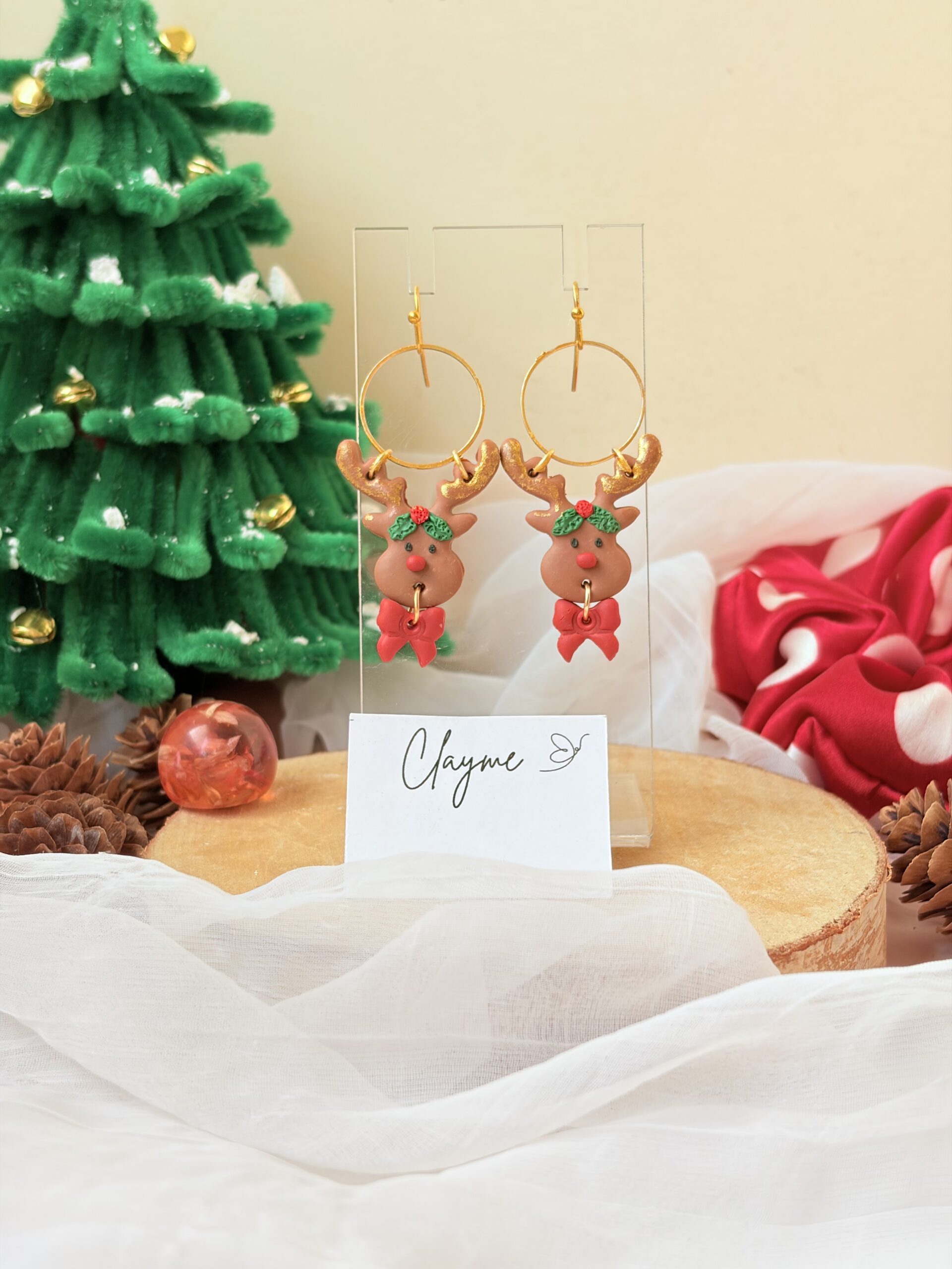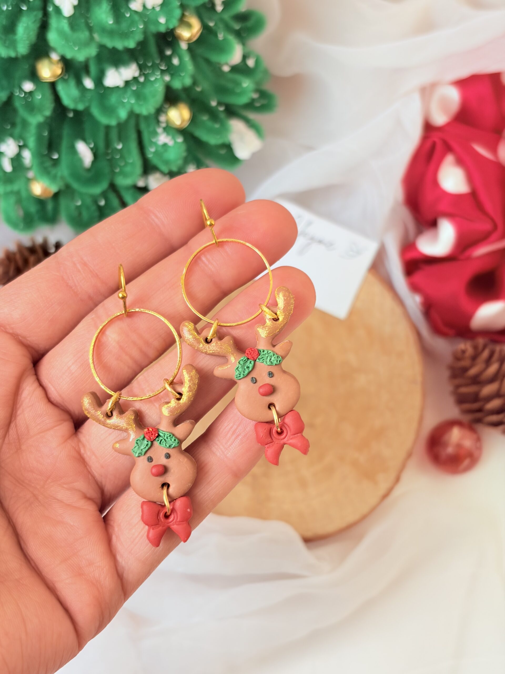 Bring playful holiday charm to your festive wardrobe with these handcrafted Reindeer Holiday Hoop Earrings. Featuring adorable polymer clay reindeer decorated with holly leaves, berries, and a cute red bow, each pair is designed to spread Christmas cheer wherever you go. The reindeer pieces hang beautifully from elegant gold hoops, creating a perfect blend of whimsy and style. Lightweight, durable, and made with hypoallergenic hardware, these earrings are perfect for holiday parties, gifting, or adding a touch of festive sweetness to everyday outfits.